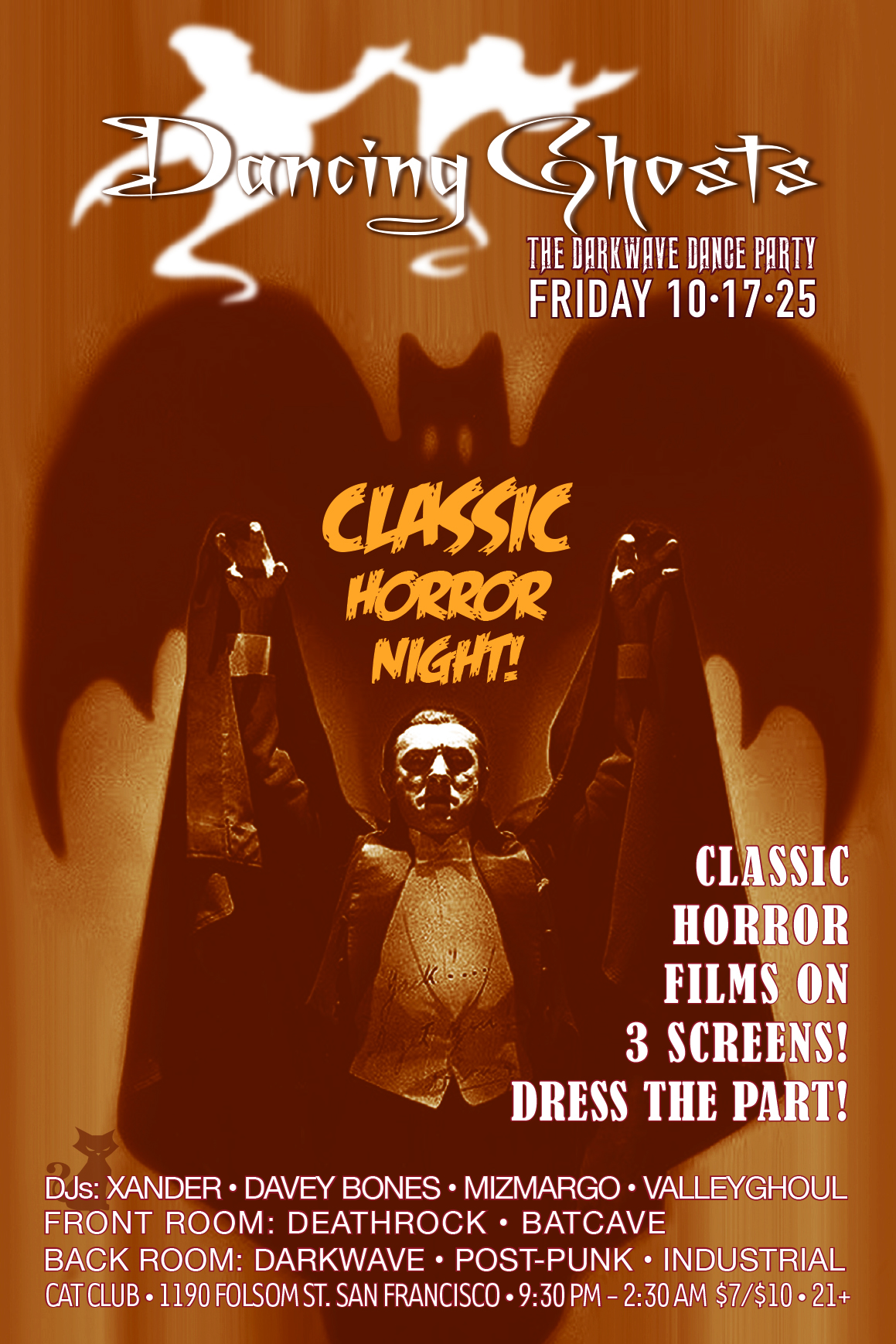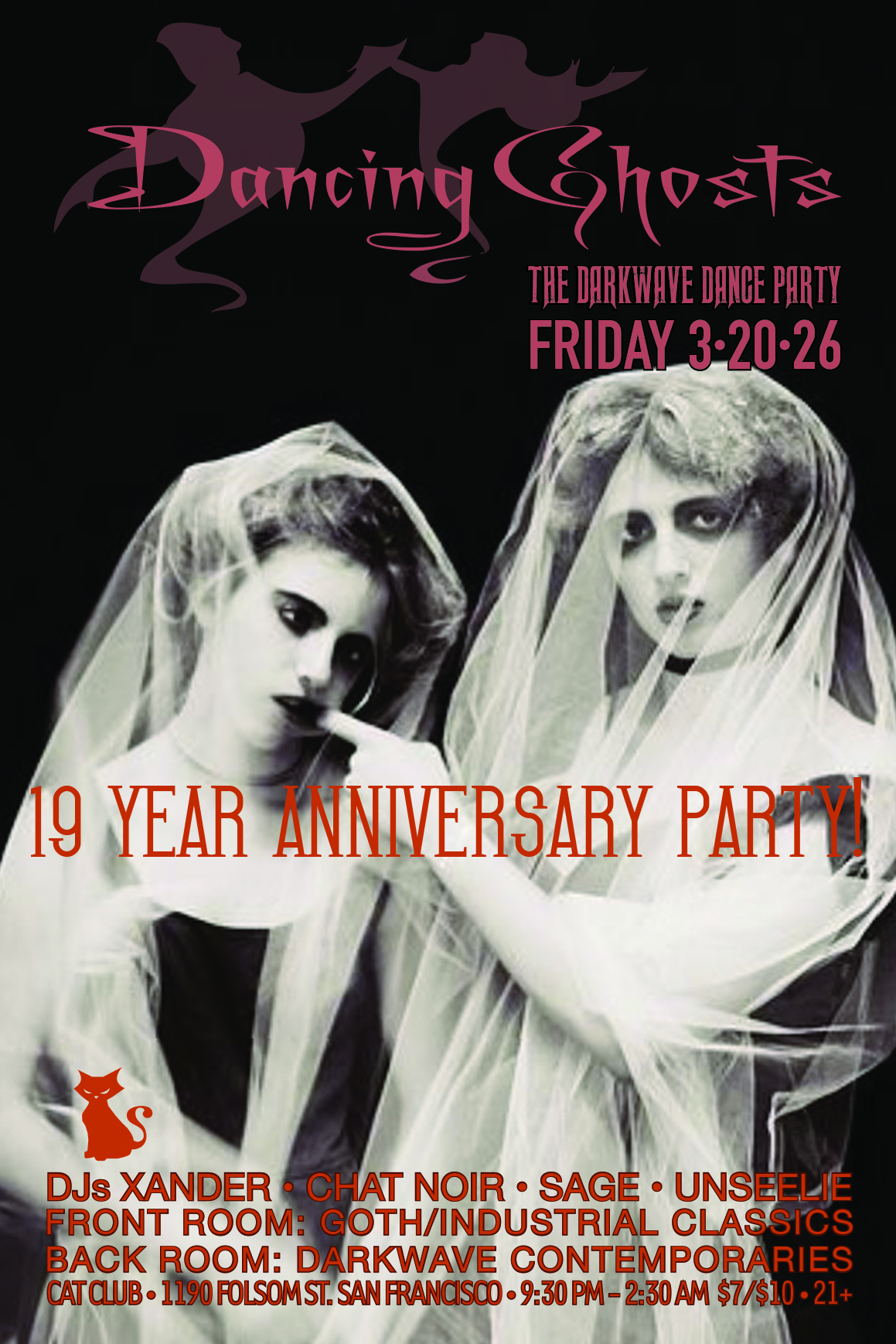 DANCING GHOSTS is San Francisco’s Darkwave Dance Party, since 2007, third Fridays at the Cat Club. Expect to hear classic and contemporary darkwave, industrial, post-punk, and more!